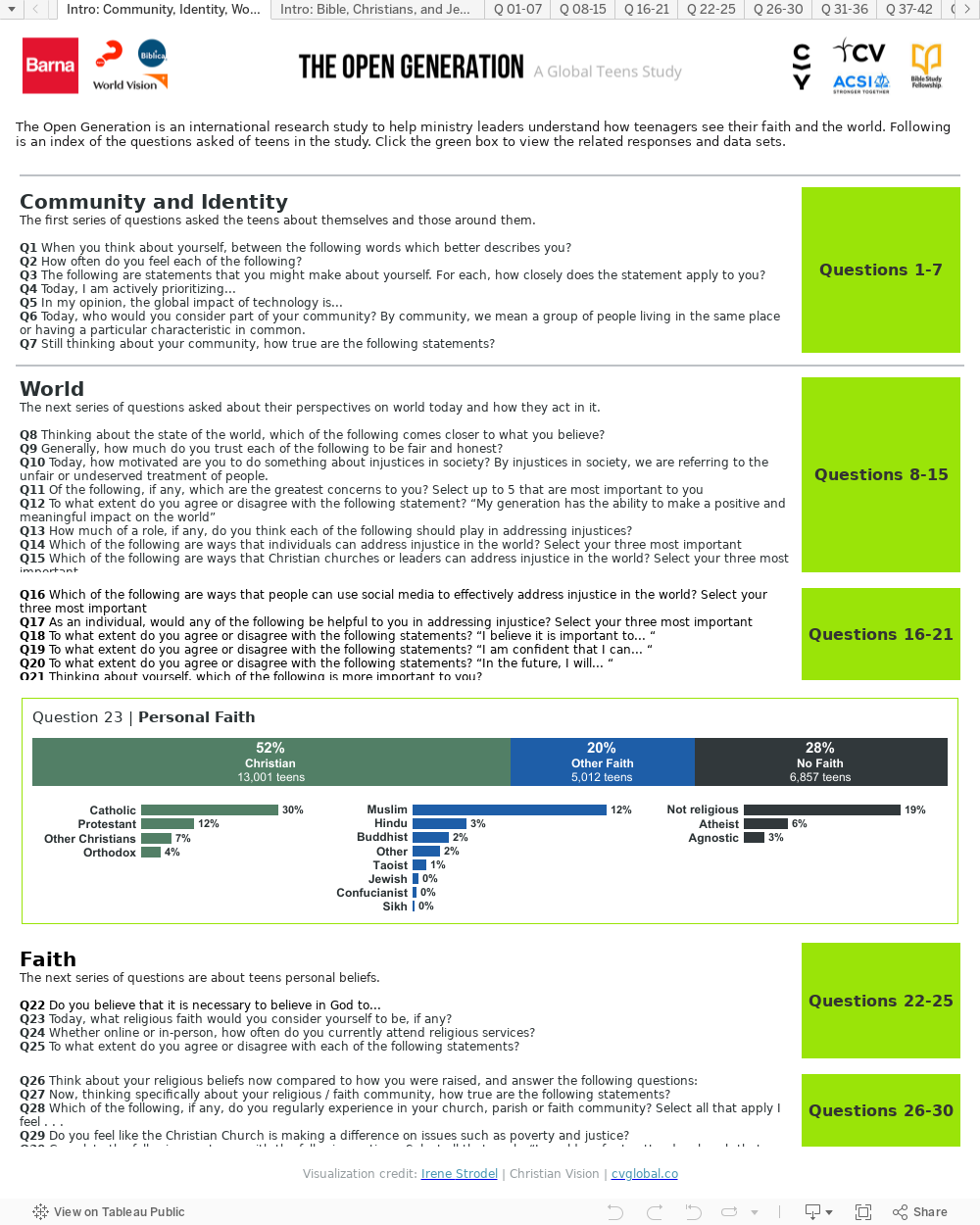 Discover even more insights from The Open Generation study with this detailed view of the research. In addition to exploring each journal, you’re encouraged to use this special tool to visualize the entire global teens survey and make use of the findings in your context. The interactive index below was developed by Christian Vision, a global ministry among the collective of partners who helped make this project possible.